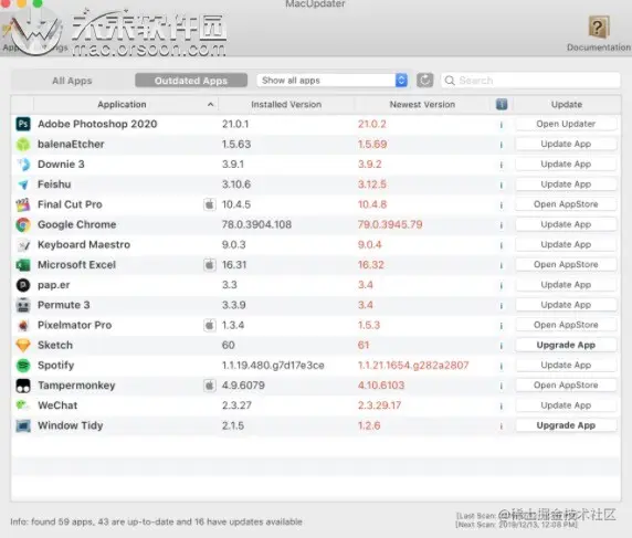 扫描完毕,可以更新的 app 会出现在「Outdated Apps」里,你可以通过旁边的分类查看这些需要更新的 app。下方的列表,就是所有可更新的 app 列表。 MacUpdater 会列出你当前 app 的版本,以及发现的最新版本,点击最右侧的升级,就能一键升级对应的 app 了。
