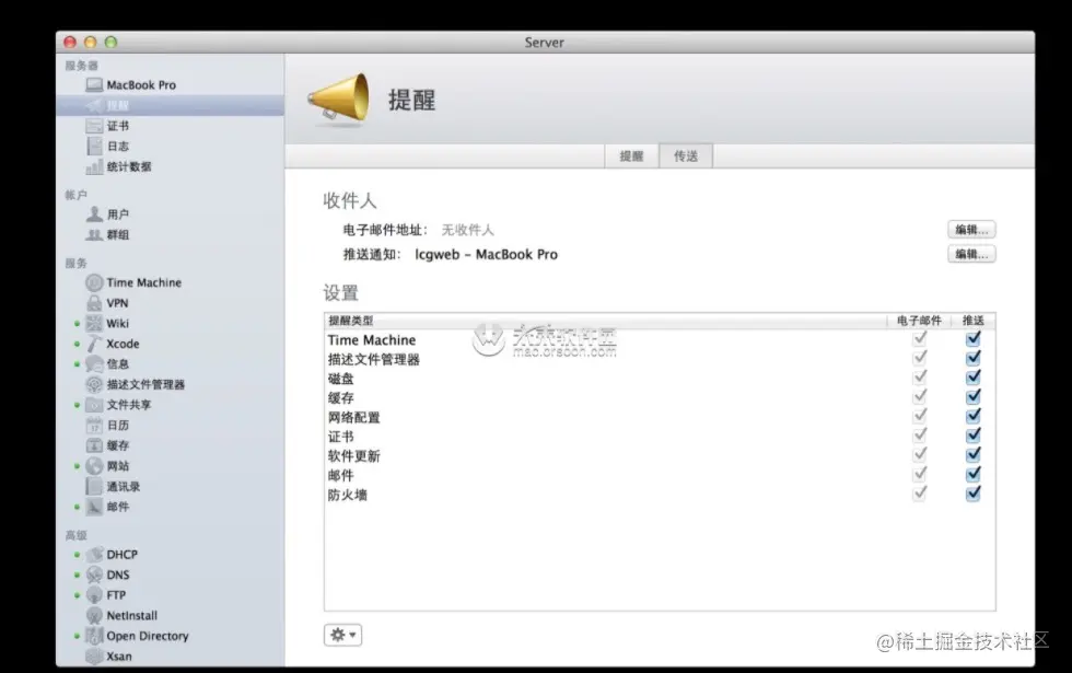当新的Alerts产生时,推送通知也会被用于向服务器管理员们发出警报,而且任何与该服务器连接且使用Server.app的Mac设备都将在自己的通知中心内收到警报。