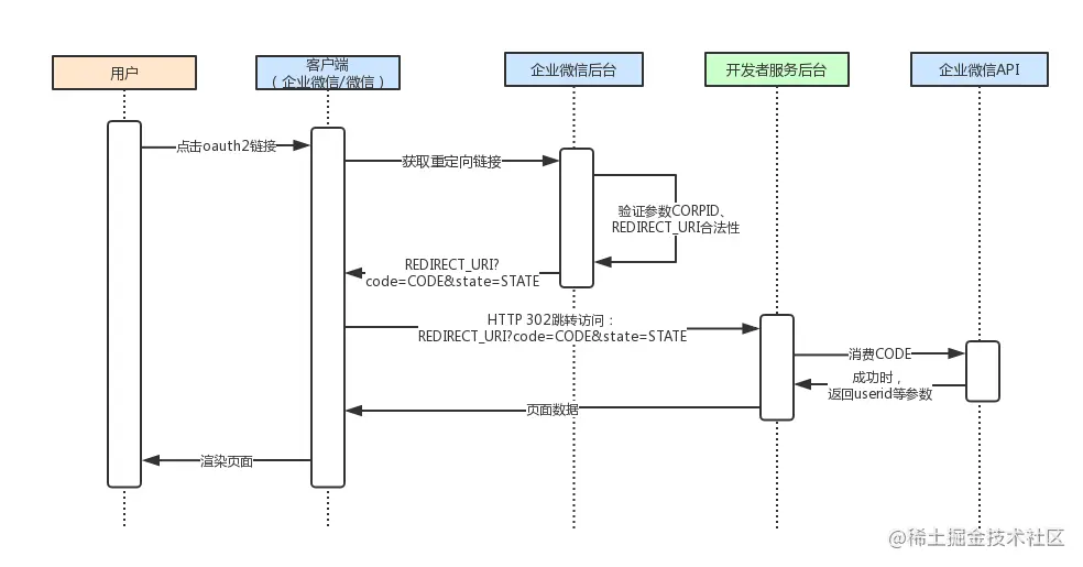 appid企业的CorpIDredirect_uri授权后重定向的回调链接地址,需对链接进行urlencode处理response_type返回类型(固定值code)scope应用授权作用域(固定值snsapi_base)state(选填)重定向后会带上state参数(a-zA-Z0-9长度不可超过128个字节)#wechat_redirect终端使用此参数判断是否需要带上身份信息