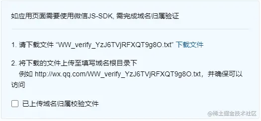 进入企业微信工具后台-应用管理-开发者接口-点击设置可信域名,下载***.txt文件,交予运维人员上传至对应域名根目录下。