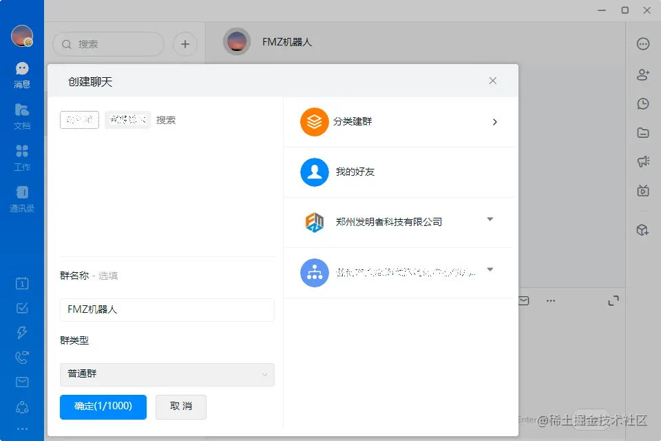 钉钉群每创建一个自定义机器人都会产生唯一的Hook地址,我们称为WebHook地址,通过向该WebHook地址推送消息,钉钉群就会收到消息。我们以PC端钉钉为例,首先点击左上方“+”号发起群聊,如果只想自己接受消息,可以随便拉两个人再踢出去,填写群名称:“FMZ机器人”,群类型选择普通群即可。