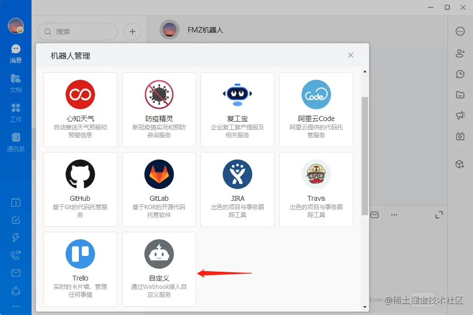 点击头像,选择机器人管理,然后选择自定义,点击添加。自定义机器人名字:“FMZ”,添加到刚刚创建的钉钉群。机器人支持三种安全设置: