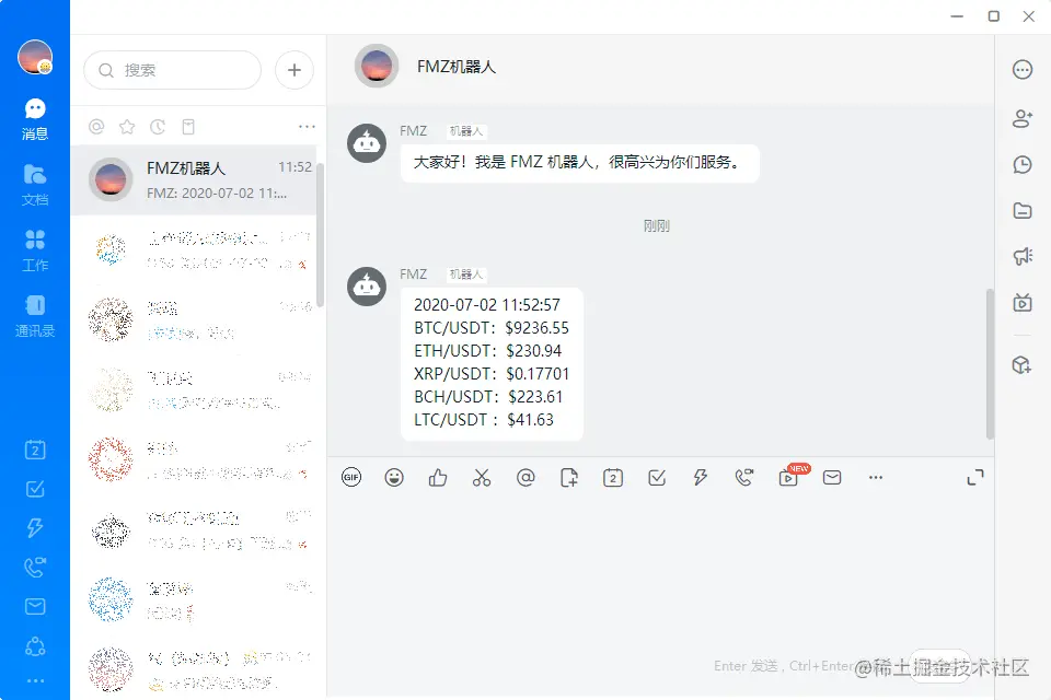 以上代码我们写了一个案例,每隔一分钟获取主流数字货币的价格,并且把这些信息推送到钉钉群中: