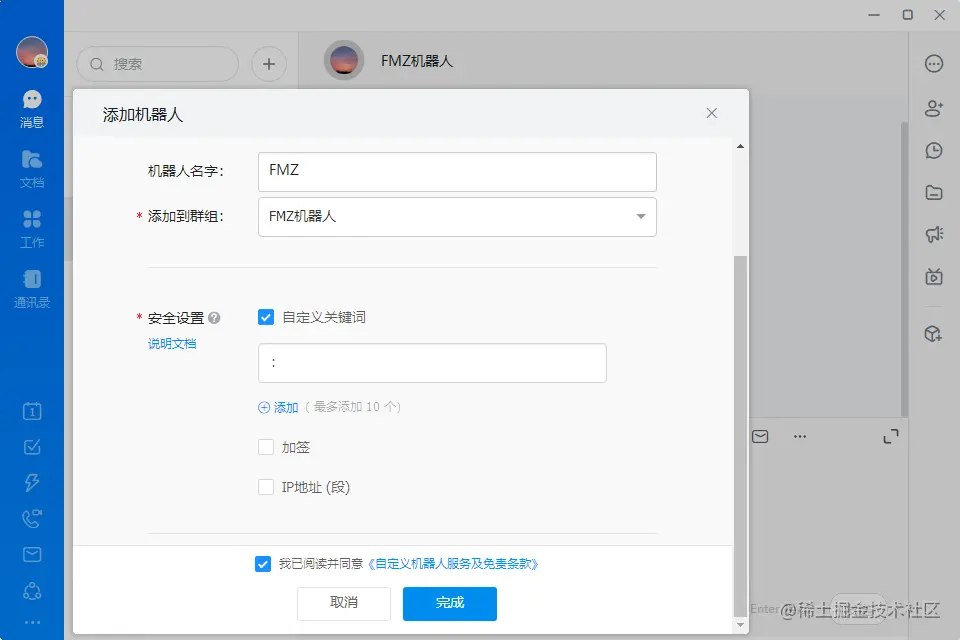 如果只用于提醒或报警,选择自定义关键词就可以了。在这里我们定义的关键词是“:”,也就是说当发明者量化机器人推送的信息中包含“:”时,这条信息才会推送到钉钉群中。然后点击同意协议完成。最后复制Webhook地址备用。