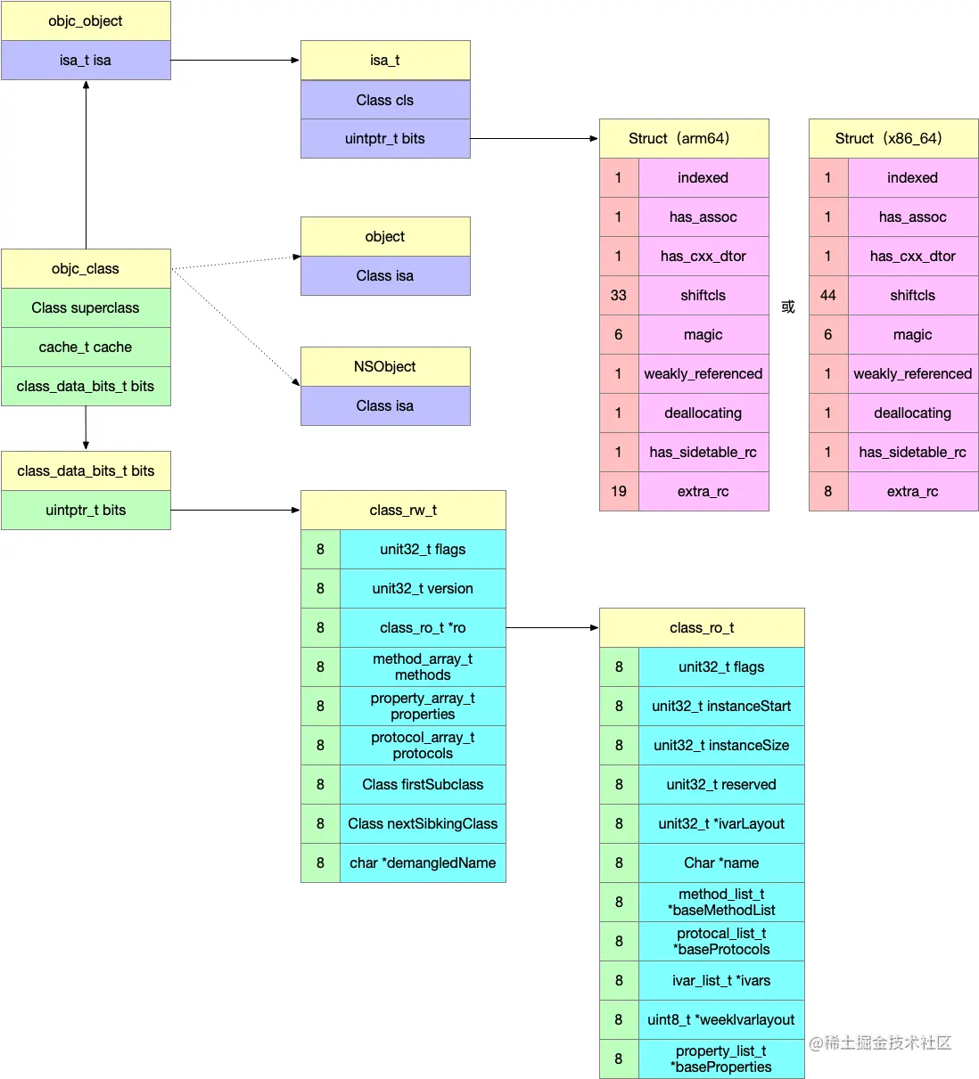 这里直接上图会比较清晰一些,源码的追踪过程这里就不赘述了。主要追踪关键方法objc_class : objc_object。