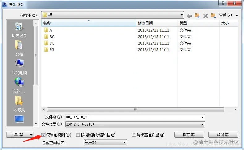 对revit模型的应用中,由于模型过大,不得不进行模型拆分导出。本文针对模型单构件导出ifc,写了个小功能。revit支持只仅导出视图可见的模型,窗口操作如下图: