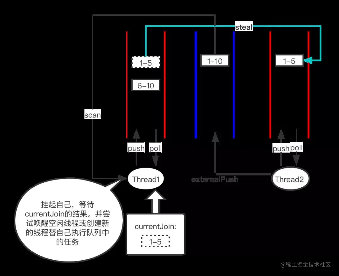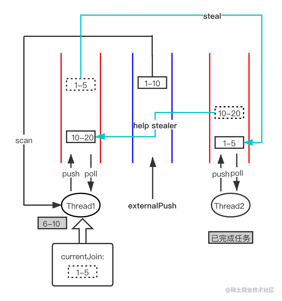 假设求和 1-10任务被Thread1执行,fork出两个子任务:1-5 和 6-10。6-10已成功执行完成,join返回了结果。但此时发现1-5被Thread2偷走了,自己的任务队列中已经没有任务可以执行了。此时Thread1可以找到小偷Thread2,并偷取Thread2的10-20任务来帮助它执行。