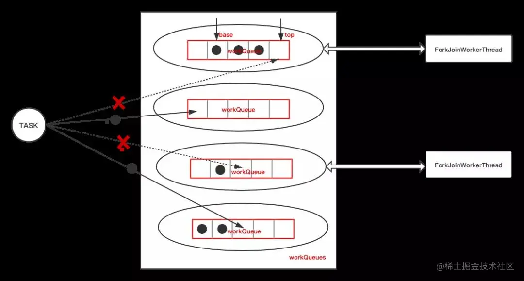 如果提交到ForkJoinWorkerThread自己的双端任务队列中:不管提交到头还是尾,都会和我们上面分析的三个操作发生任务冲突。而且如何选择负载最小的线程来提交也会增加问题复杂性。
