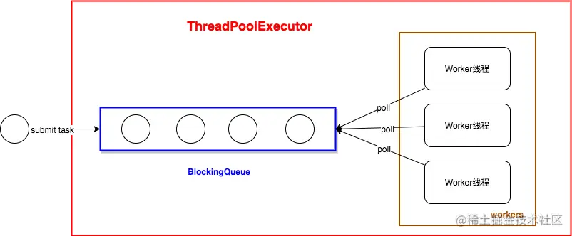 任务都是丢到一个同步队列BlockingQueue中的。如果你了解JDK BlockingQueue的实现,就知道有界的同步队列都是用锁阻塞的,有些push/poll操作还共用一把锁。