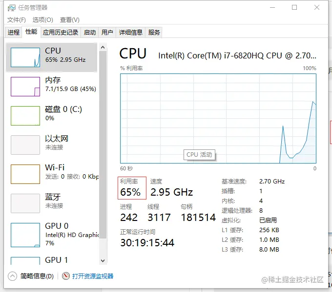 可以看出cpu的利用率飙升到了65%,这时候cpu占用率已经很高了。