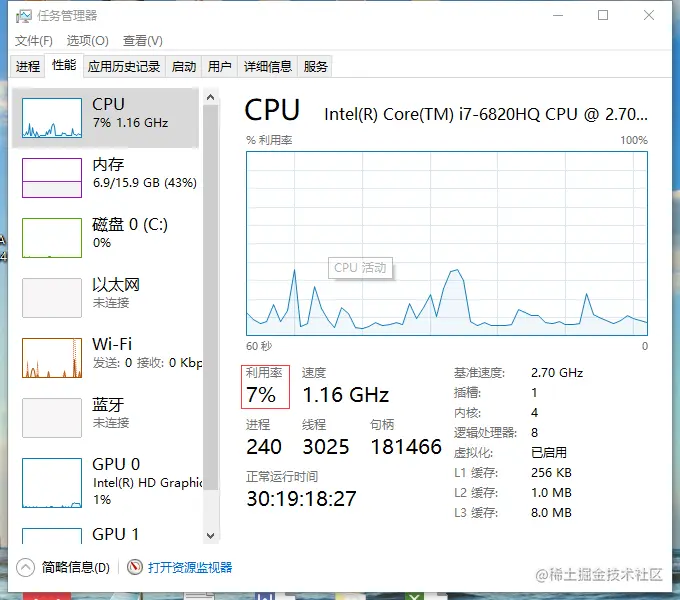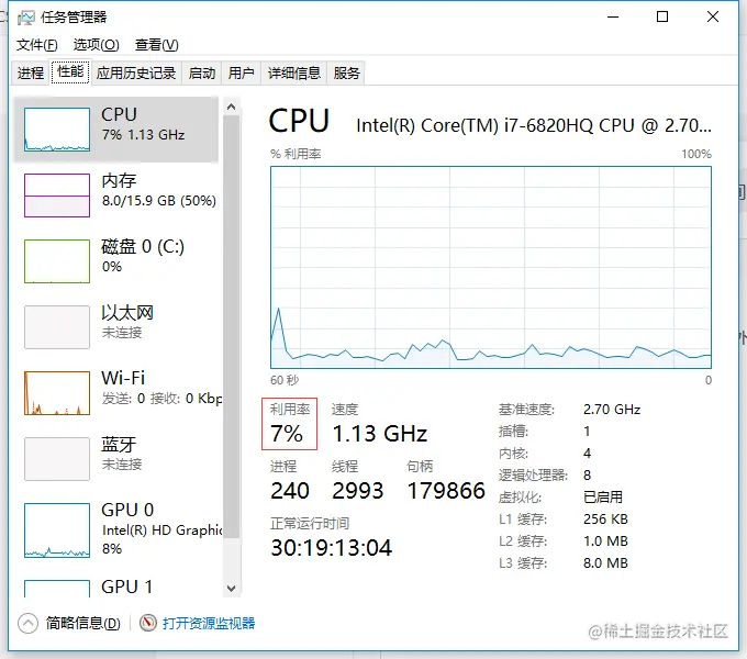 下图可见cpu的利用率还是在7%左右,由此可以证明sleep方法并不会占用CPU的时间