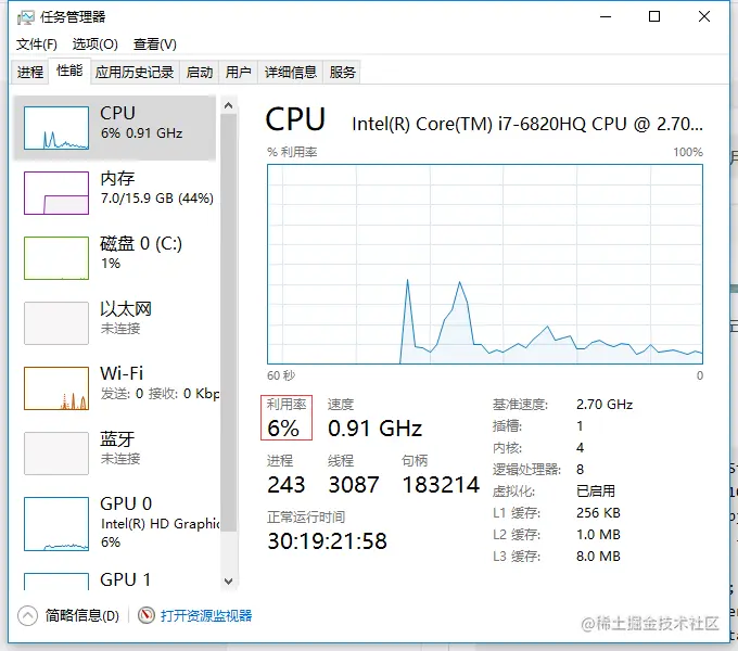 下图可见 CPU 利用率是 6% ,由此可以证明wait方法也不会占用CPU的时间