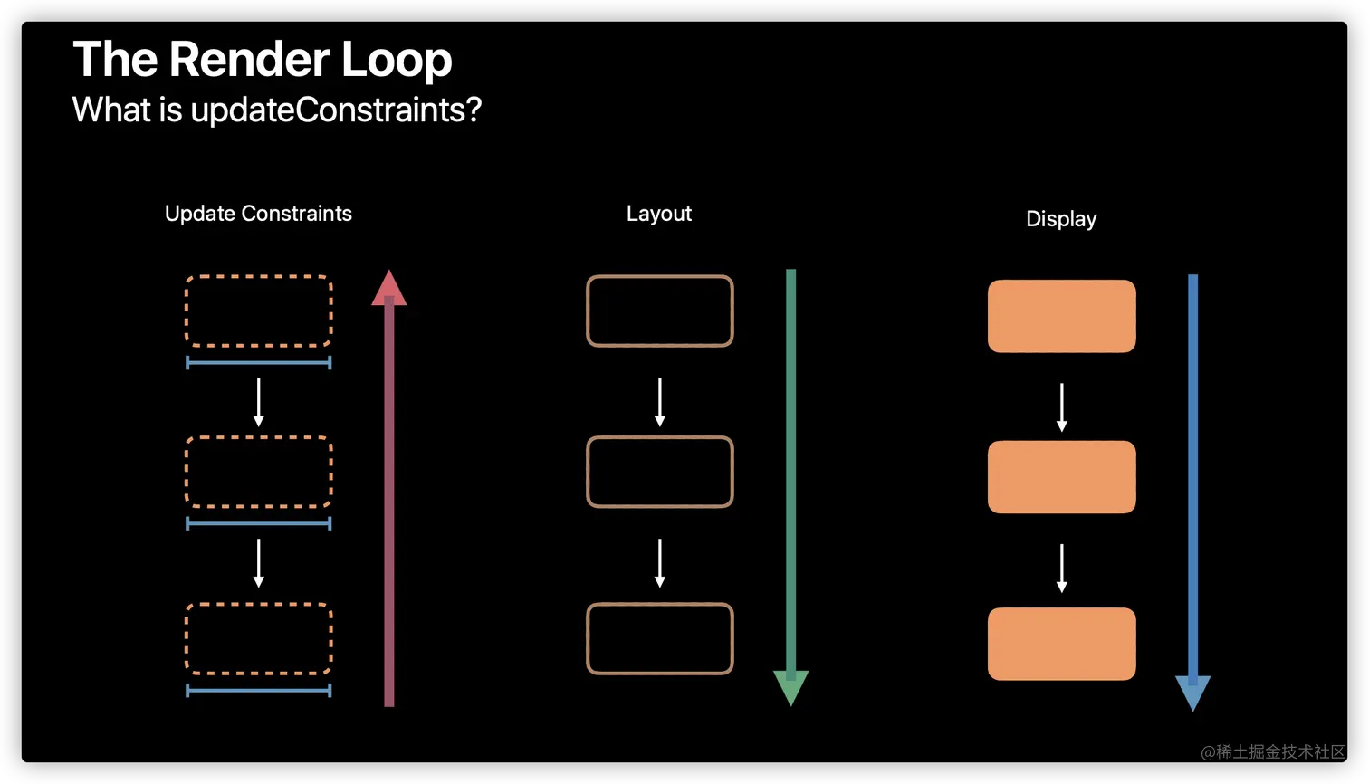 Constraints Change属于Render Loop的一部分。渲染循环是一个每秒钟跑120次的进程。从而确保所有的内容能出现在每一帧上。它包含3个阶段: