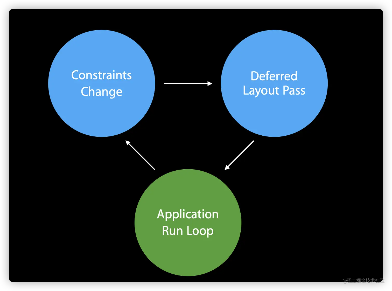 每个视图在得到自己的布局之前,Layout Engine 会将视图、约束、优先级、固定大小通过计算转换成最终的大小和位置。在 Layout Engine 里,每当约束发生变化,就会触发 Deffered Layout Pass,完成后进入监听约束变化的状态。当再次监听到约束变化,即进入下一轮循环中。整个过程如下图所示: