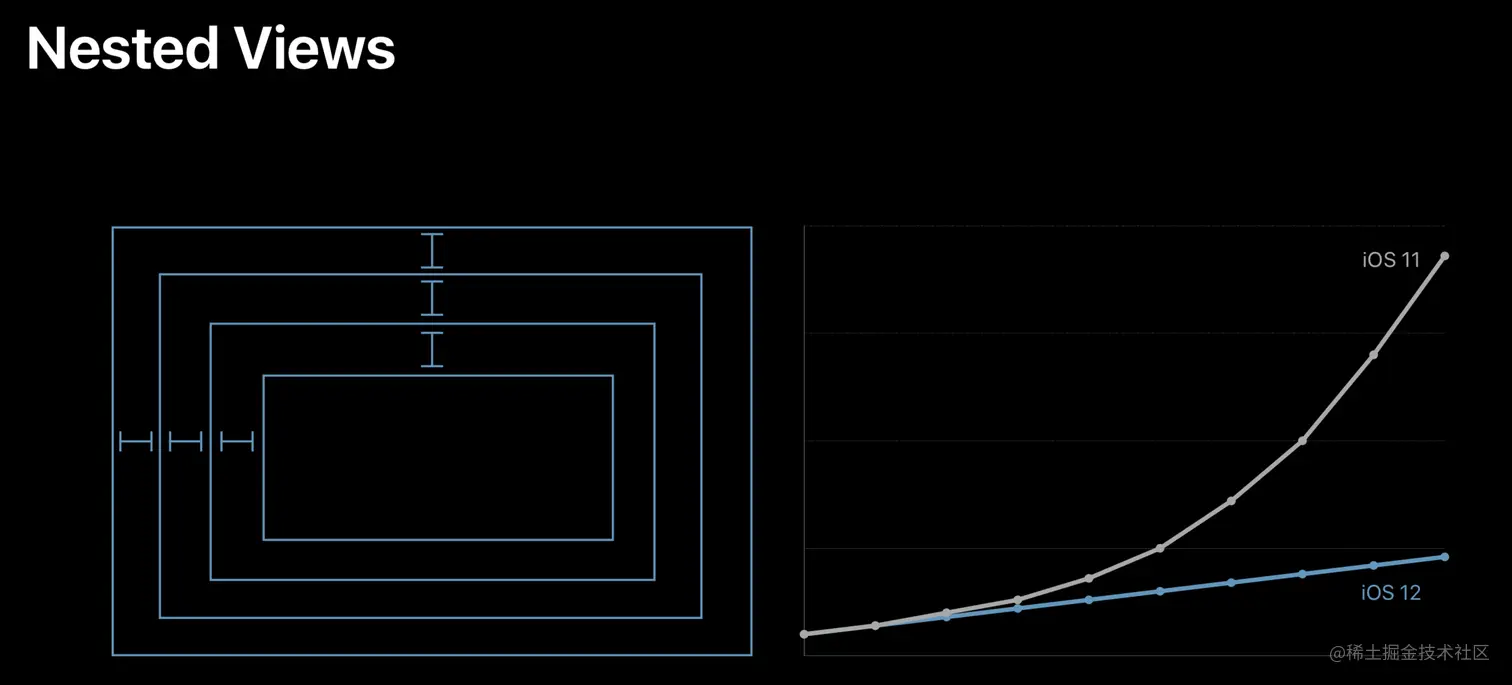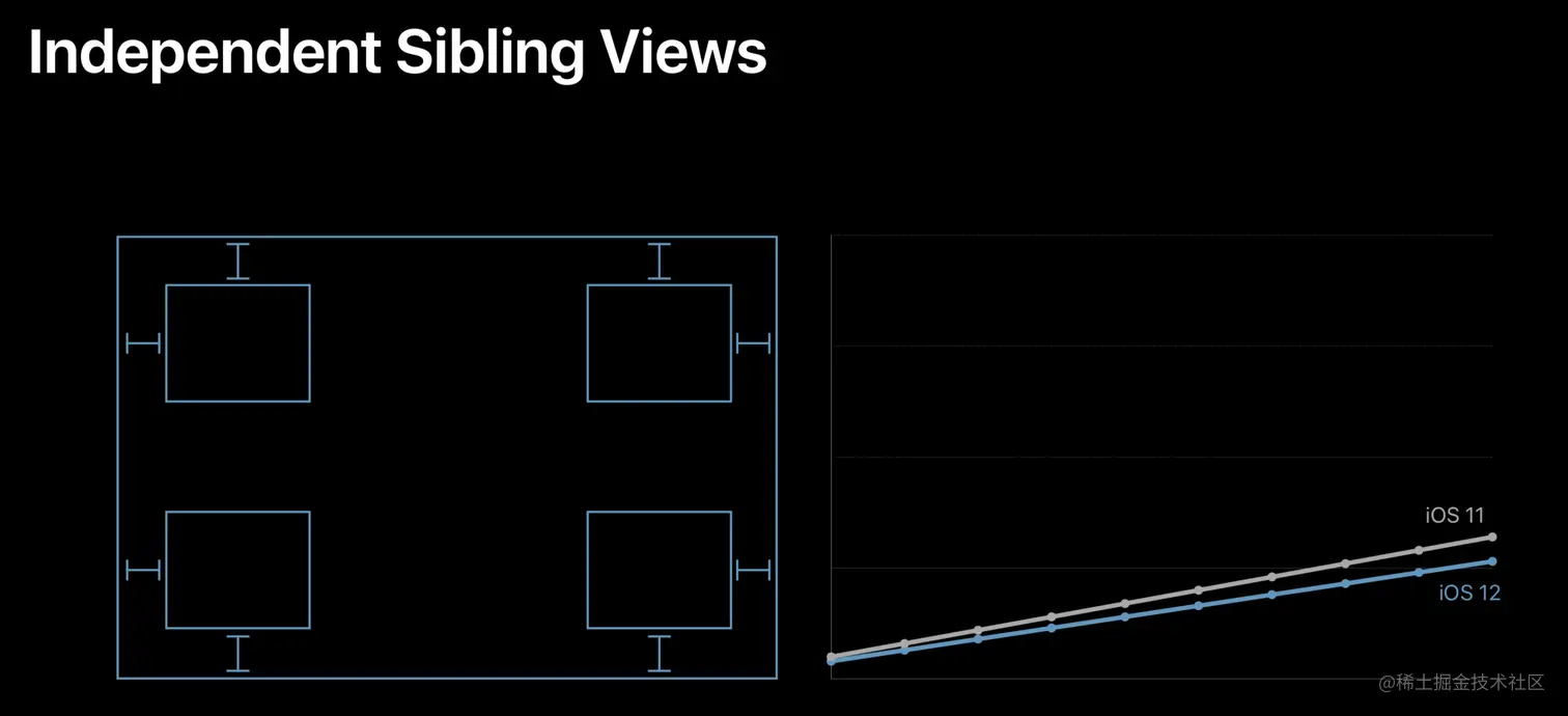 Auto Layout 在 iOS 12 中优化后的表现。可以看到,优化后的性能,已经基本和手写布局一样可以达到性能随着视图嵌套的数量呈线性增长了。而在此之前的 Auto Layout,视图嵌套的数量对性能的影响是呈指数级增长的。