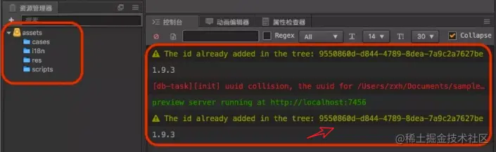这种情况又是怎么造成的呢?当有一个人将新资源添加进项目时,忘记切换到编辑器界面使其生成 meta 文件,同时又将这些新增的文件提交到了版本管理中(不包含 meta 文件)。然后,有另一个人去更新了他所提交的资源,同时切换到了编辑器界面进行编辑,这时 Creator 会检查到新资源没有 meta 文件便会立即生成。而当第一个人切换到编辑器的时候也会生成 meta 文件,这样两个人的电脑上为同一个文件,但是生成的 meta 文件中的 uuid 都不相同。
