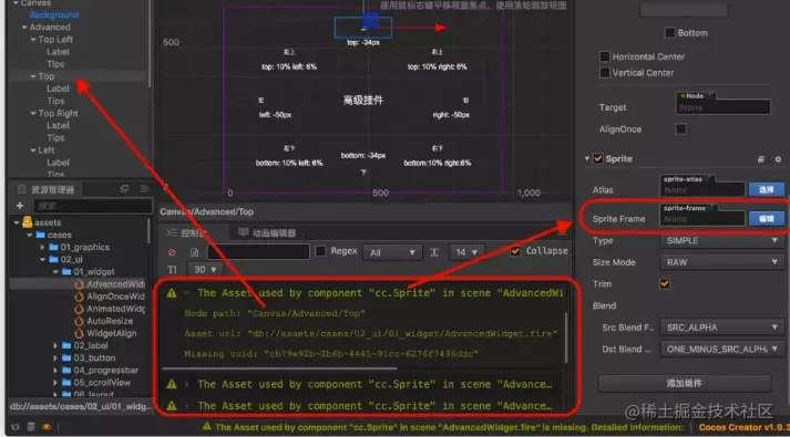 如果找不到旧的 uuid 对应的资源,通过 控制台 可以看到 Creator 给出了所在的场景文件名、节点路径、组件、uuid 等非常详细的警告信息。通过警告信息可以快速定位出错的地方。