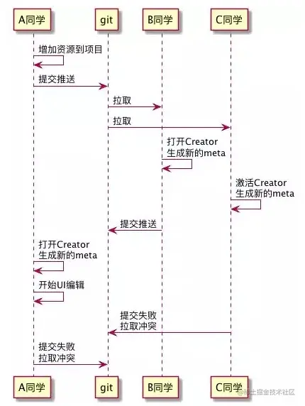 因为第一个 A 同学忘记生成 meta 文件并提交,之后其他人都编辑过项目,但每个人生成的 uuid 都不同,这样就会陷入无限的资源出错中,编辑好的东西,一提交更新又出现冲突了。