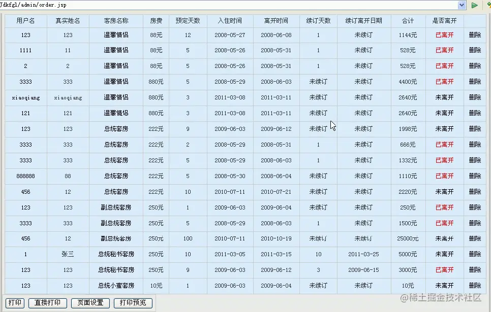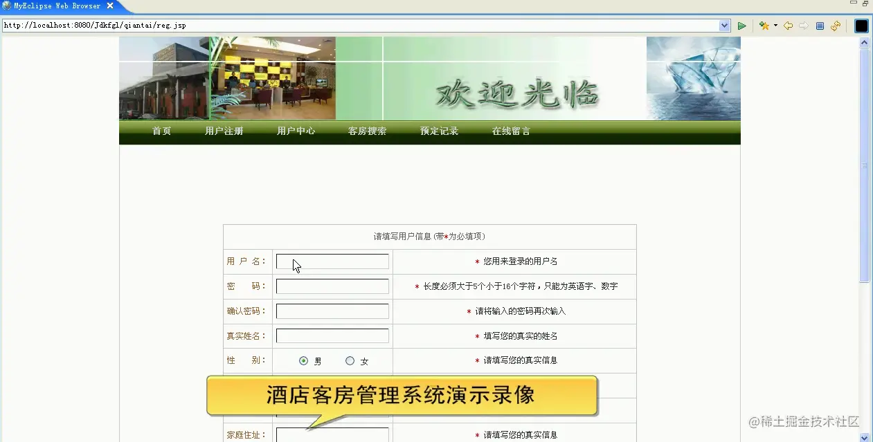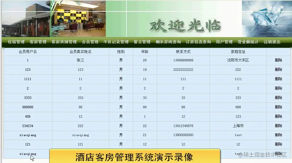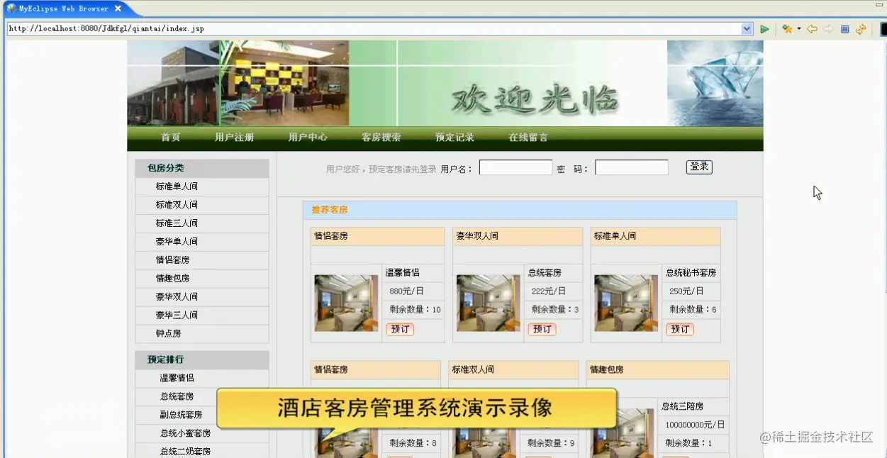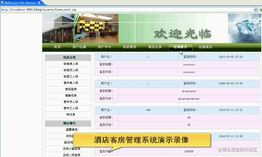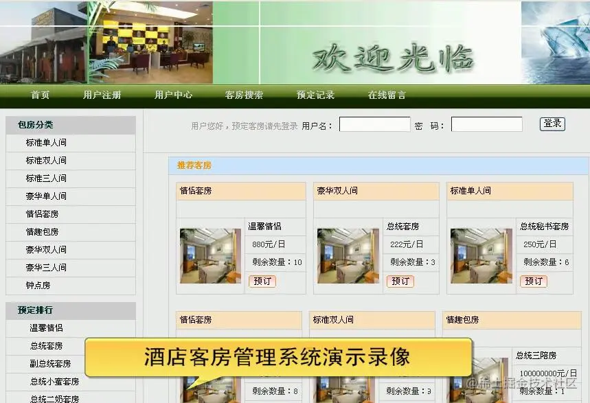 本文基于JAVA,JSP,SERVLET,MYSQL技术进行酒店客房管理, 酒店客房功能分为前台和后台, 前台功能包含:首页, 用户注册,用户中心,客房搜索,预定记录,在线留言,后台功能包含:住宿管理,客房管理,客房类型管理,会员管理,不良记录管理, 留言管理,剩余房间查询,订房信息查询,用户管理,营业额统计