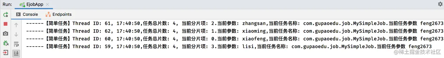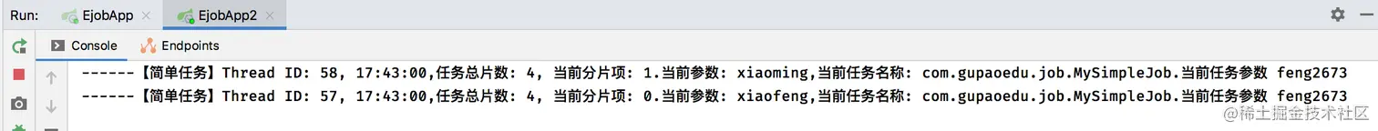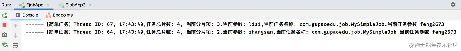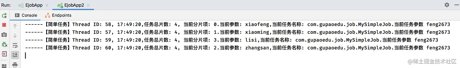 清空控制台,可以看到EjobApp2节点拿到了四个分片(0,1,2,3)