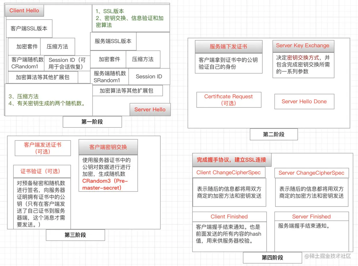 ChangeCipherSpec(编码改变)的消息通知(告知服务器我已经准备好用我们之前商量好的加密套件进行加密并传输数据了)、前面所有消息的 hash 值以及加密数据 CRandom3进行服务器验证 - 使用与服务器确认的加密算法对 CRandom1、CRandom2、CRandom3 三个随机数进行加密,生成 Session Secret(这个就是后边使用对称加密算法进行传输数据时所用到的对称加密密钥,还可用来