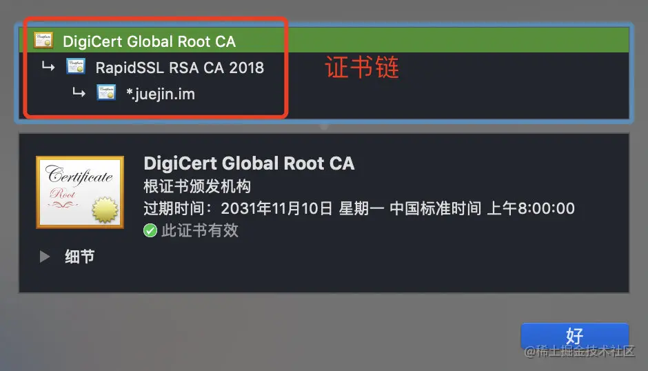 end-user:末端使用者(证书)。图中的末端证书就是 *.juejin.im 使用的数字证书。