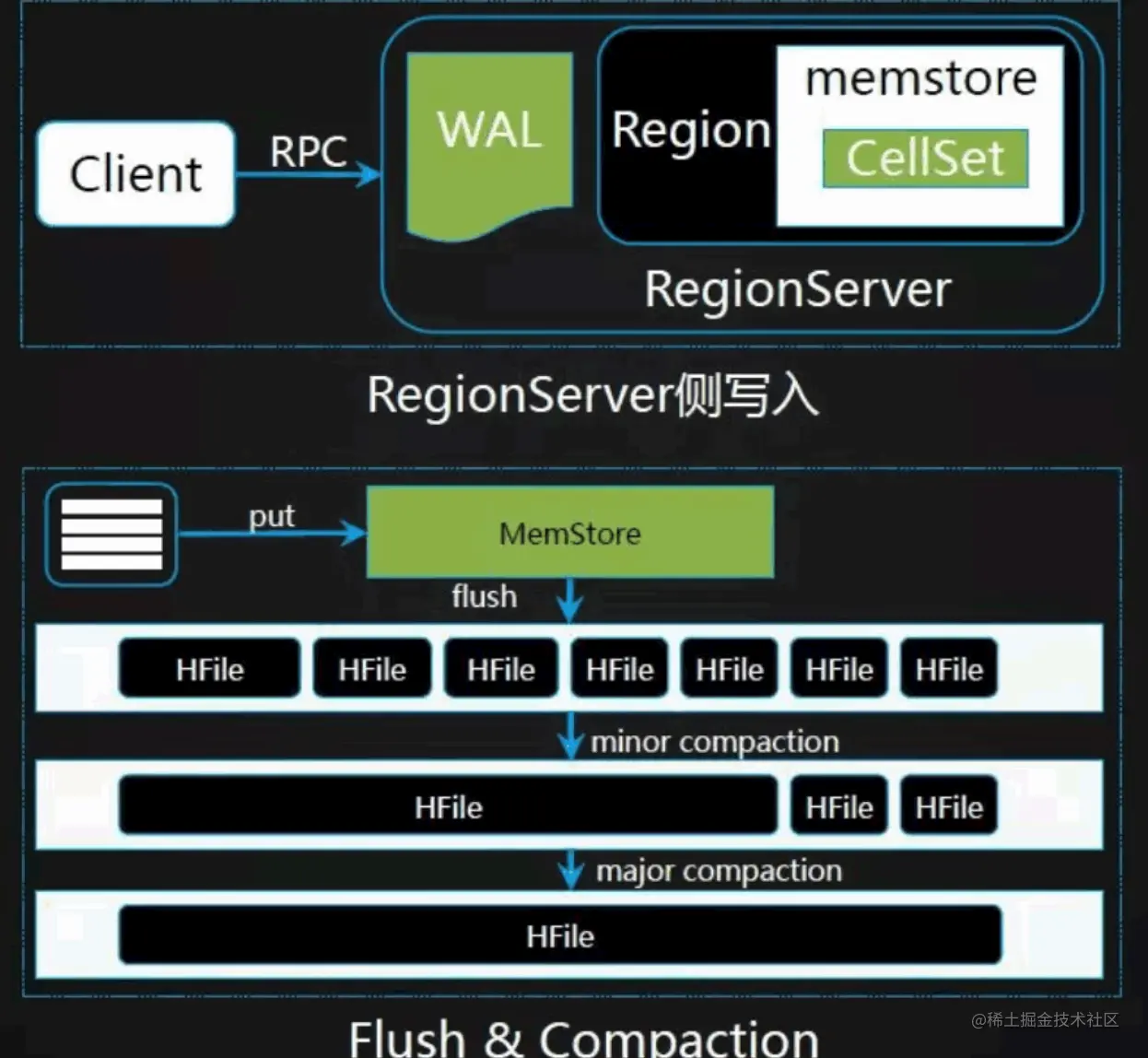 客户端通过发请求到RegionServer端,写入的时候会先写入WAL日志中,其次会将数据写入memstore内存,当数据达到一定大小后会flush成一个个的StoreFile(HFile)文件,当文件达到一定数量后,通过compaction的操作合并成更大文件,这样数据读取会更快。