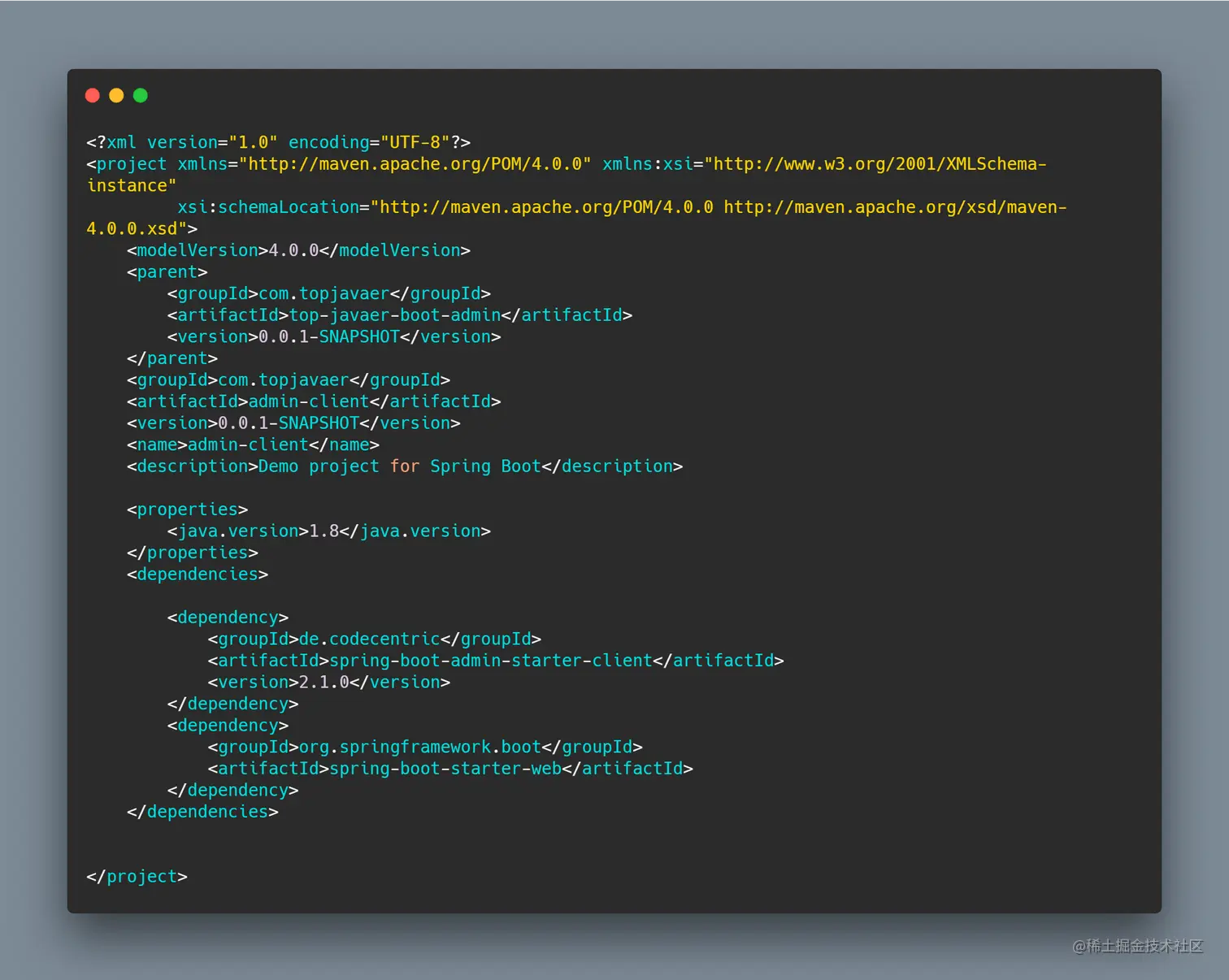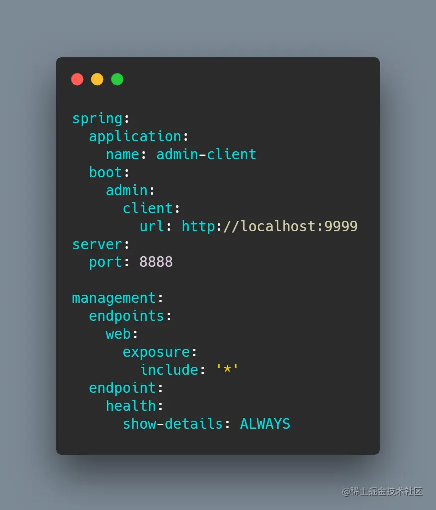 接下来我们创建一个 Admin-Client 项目,用来向 Spring-Boot-Admin 注册服务或者实例,我们需要在 pom.xml 文件中引用 spring-boot-admin-starter-client 的依赖。然后我们需要在启配置文件指定 Spring-Boot-Admin 的服务地址,最后启用 Admin-Client。