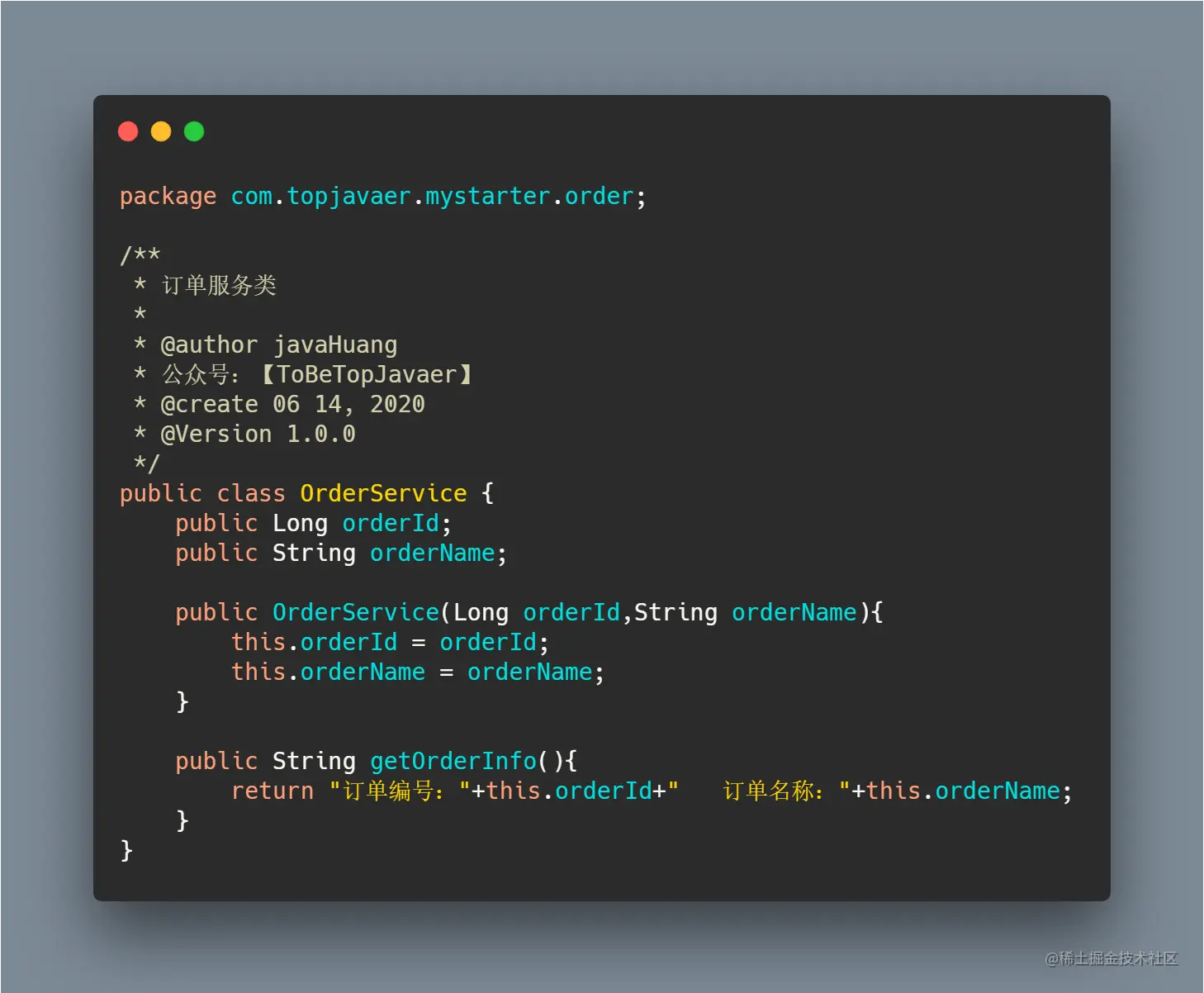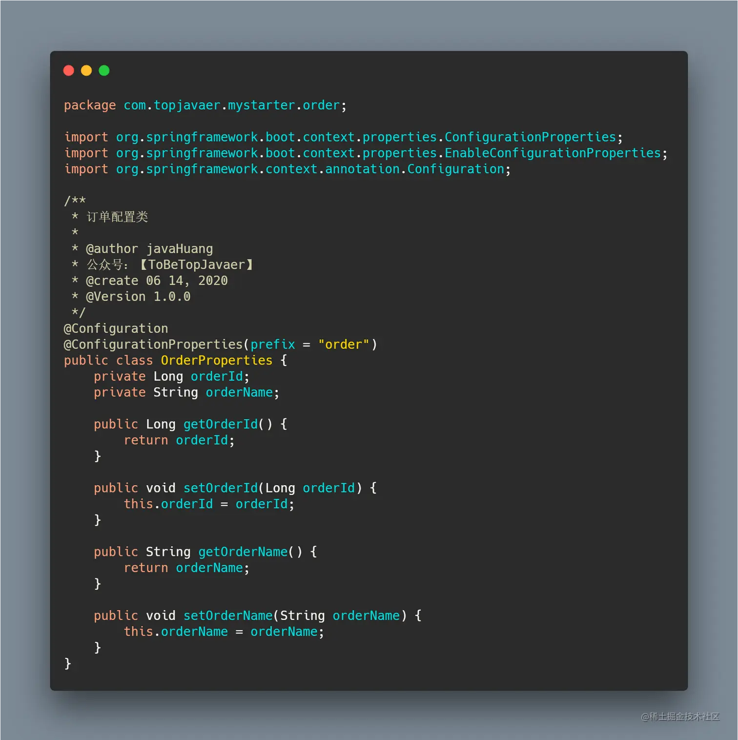 第二步,编写一个实体类映射信息 OrderProperties 类,使用@ConfigurationProperties 来注入配置信息,然后定义一个 OrderService 类。