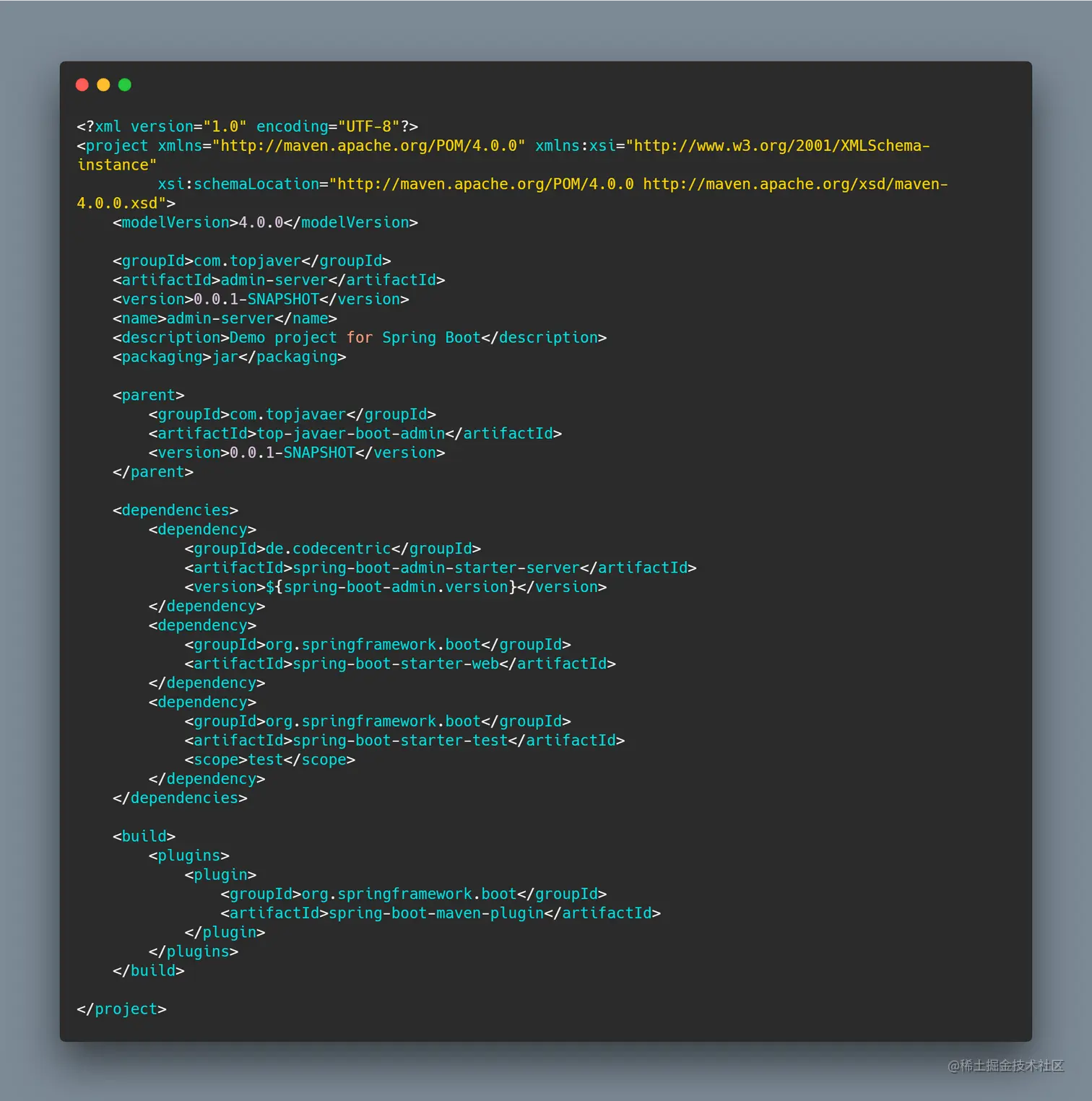 第一步,我们先建一个 Admin-Server 的项目,用来启动 Spring-Boot-Admin 服务,我们需要在 pom.xml 文件中引用 spring-boot-admin-starter-server 的依赖。然后我们需要在启动类上增加 @EnableAdminServer 的注解,最后启用 Spring Boot Admin Server。