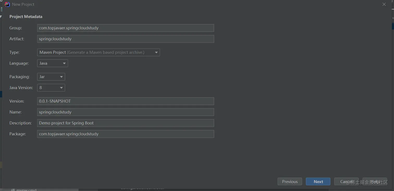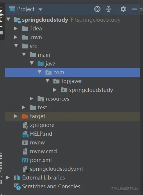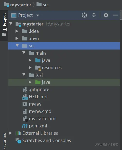 首先我们按照上述创建 Spring Boot 项目的步骤新建一个 MyStarter 工程,创建好后,工程结构如下: