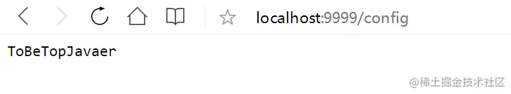 首先,我们配置文件中配置 spring.name=ToBeTopJavaer 时,我们来启动项目,运行 localhost:9999/config。