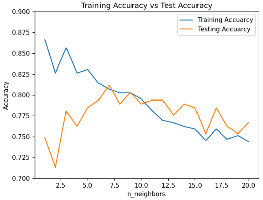 看上面的图表!当n_neighbors 为7时,训练和测试的准确率均在80%以上。