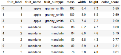目的是训练一个模型,如果我们在模型中输入质量、宽度、高度和颜色分数,模型就可以让我们知道水果的名称。例如,如果我们输入一个水果的质量、宽度、高度和颜色分数分别设置为175、7.3、7.2、0.61,模型应该将水果的名称输出为苹果。