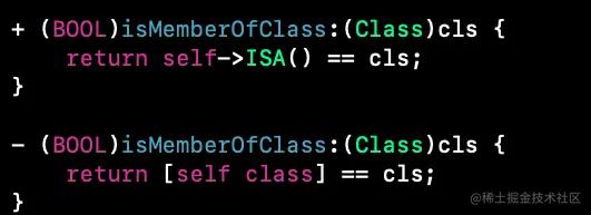 self->ISA() == cls是指如果调用者的isa指针指向类(元类)如果等于cls就返回YES,否则就返回NO。