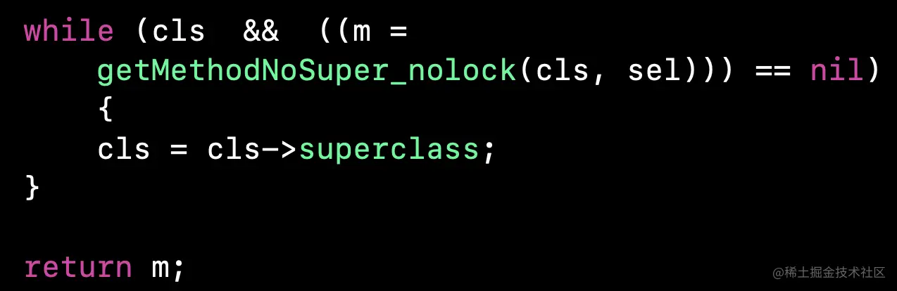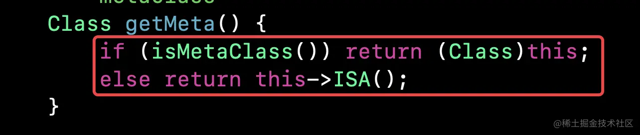 isMetaClass意思是是否是元类,这个方法意思就是如果是cls的元类就返回,如果不是就返回cls的isa指针,根据之前文章知道cls的指针指向的是cls的元类。所以这个方法就是在元类中查找是否有该方法