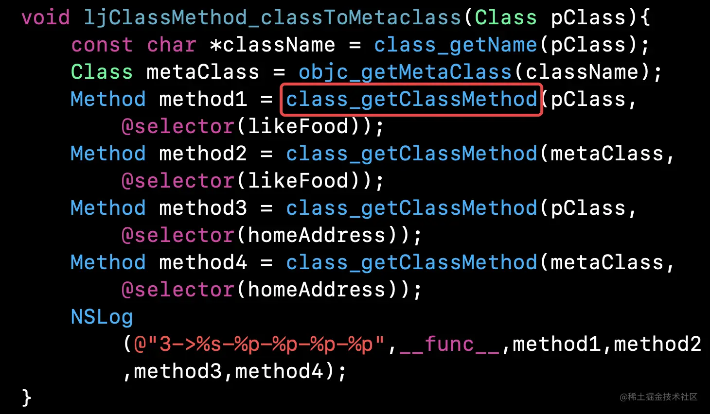 Method method4 = class_getClassMethod(metaClass, @selector(homeAddress));