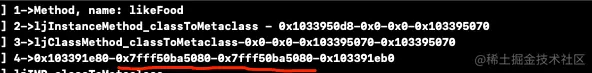 - imp2是传进去的Person的元类,在元类中找likeFood,因为likeFood是对象方法,所以找不到,走消息转发,最后返回地址