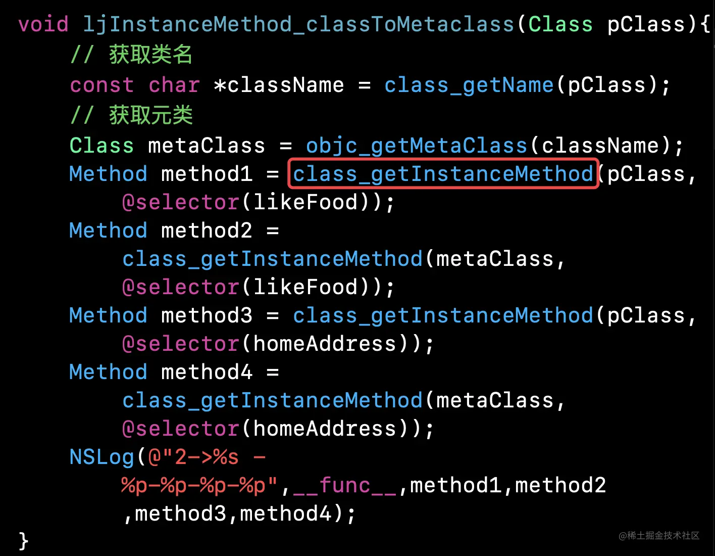 Method method4 = class_getInstanceMethod(metaClass, @selector(homeAddress));