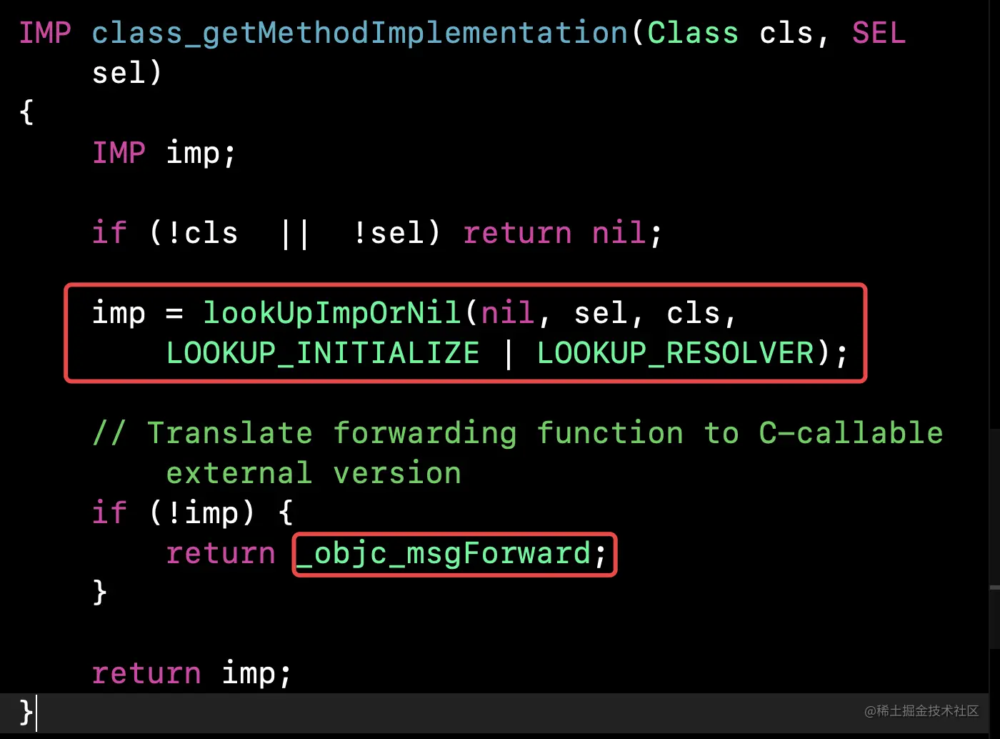 方法如下,只需要对class_getMethodImplementation方法进行分析