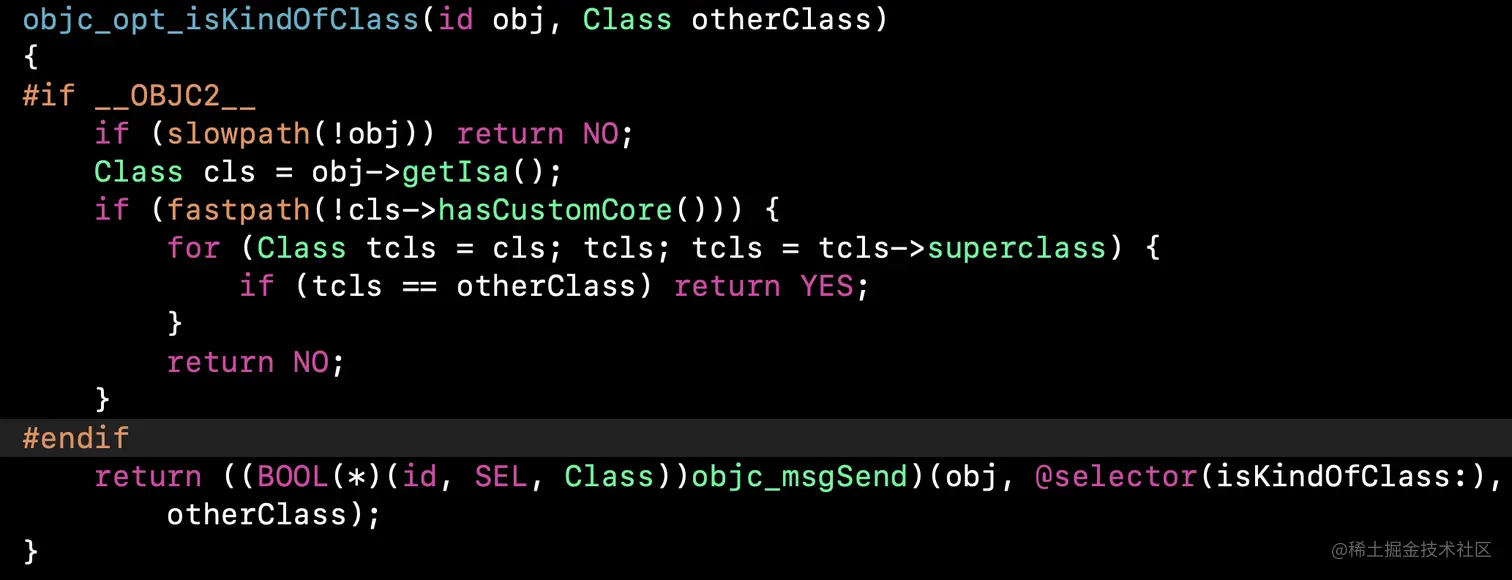 obj是调用类,Class cls = obj->getIsa();是拿调用者的isa,如果是类就是拿元类,如果是对象就是当前的对象类。for (Class tcls = cls; tcls; tcls = tcls->superclass)是for循环,让tcls等于上面获取的cls,if (tcls == otherClass) return YES;如果跟传进来的otherClass相等就返回YES,如果不是就循环,让tcls等于它的父类,一直循环跳出来前还不等就返回NO。