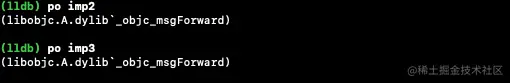 上面发现打印的都是libobjc.A.dylib`_objc_msgForward,上面我们看源码知道,找不到方法会走消息转发,那这个地址是不是某个方法呢?。这就牵扯到runTime的内容,后续我们补充