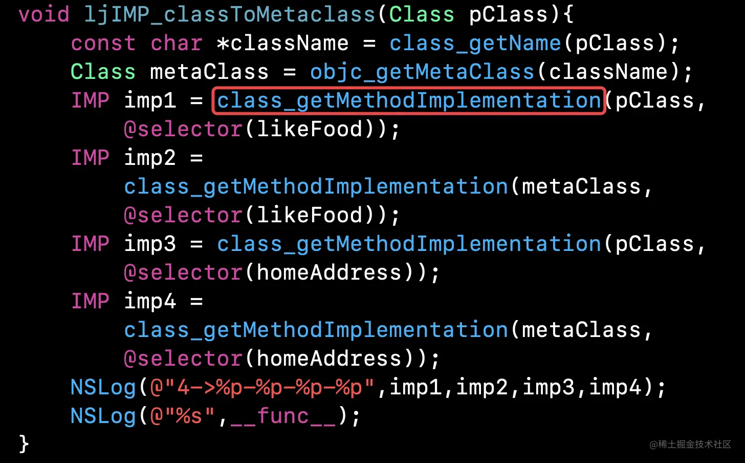 IMP imp4 = class_getMethodImplementation(metaClass, @selector(homeAddress));