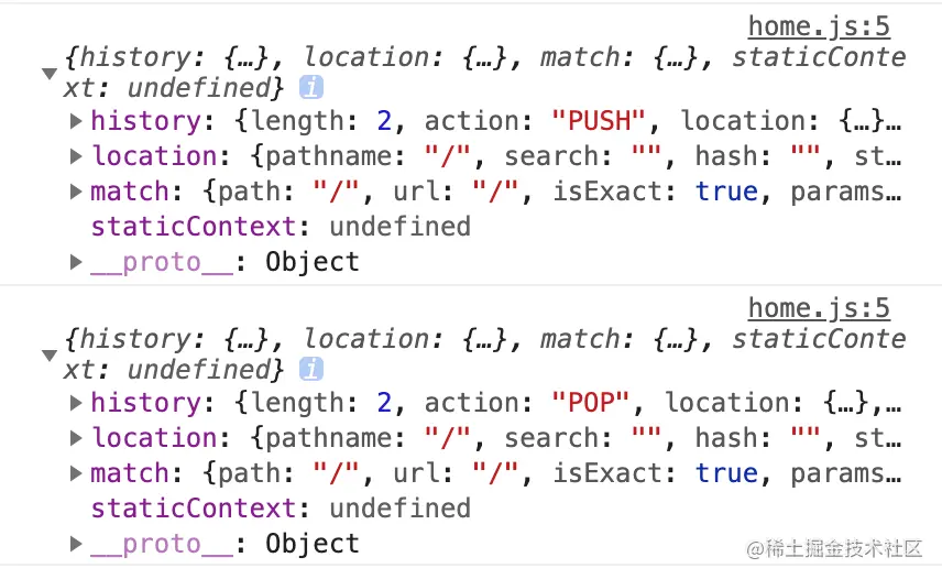 路由相关信息方法肯定是在props上的我们打印看一下,这是我的两次操作