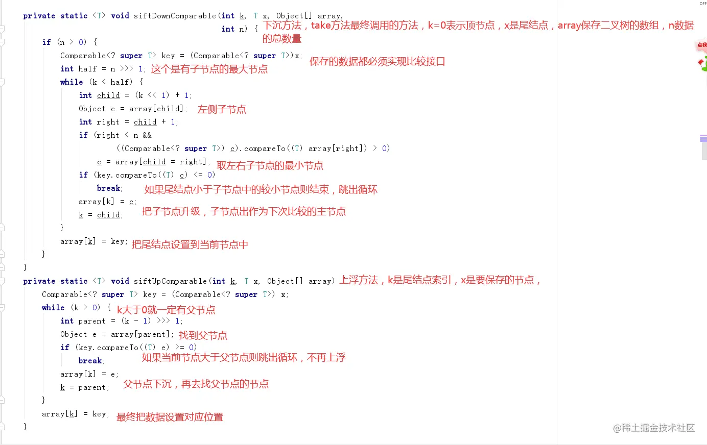 然后调用siftDownComparable方法把获取到的节点x与顶级节点较小子节点e比较,如果x大于e,则把e升级到父节点位置(此时e的父级为顶级节点或者已经审计,可以覆盖),然后继续去比较e的较小节点,直到x小于e节点则停止,把e设置到当前位置。