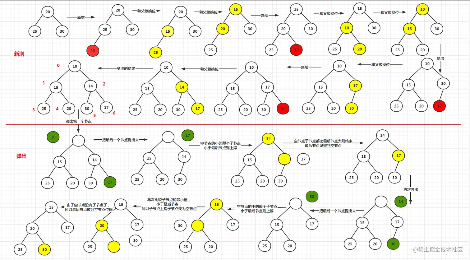 所以15会和25交换位置,然后发现他的上级20还是比他大继续交换,上浮到顶级就没有父节点,就完成了上浮。这样就保证了最小的在最上面。