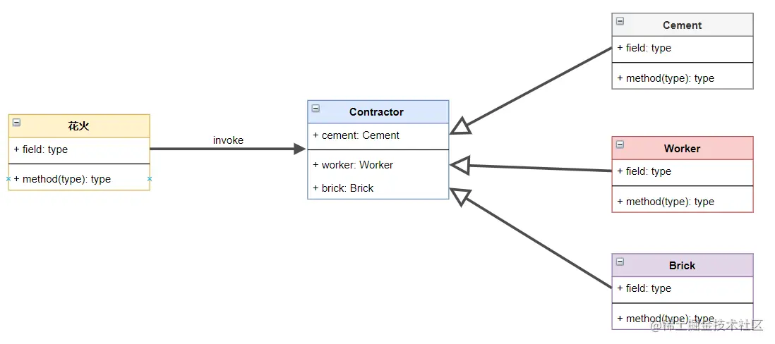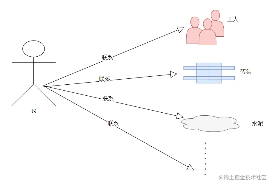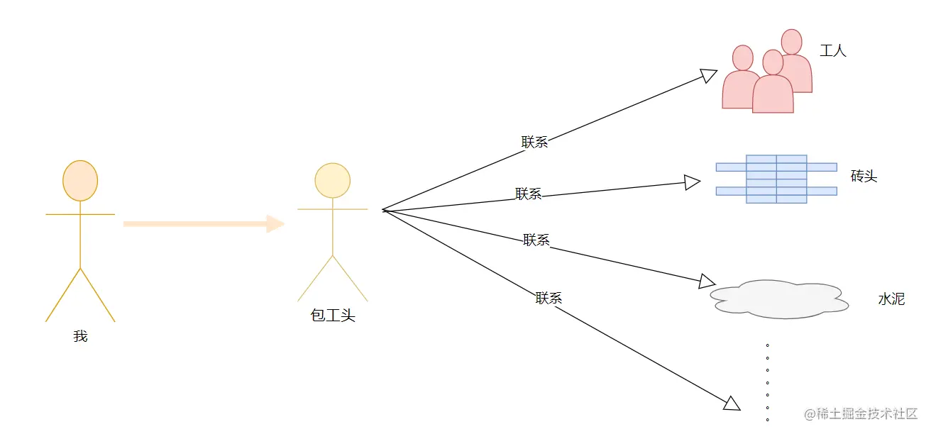 盖房子需要工人,砖头,水泥等等,我们需要一个一个联系所需要的人。但我这么聪明当然不会这么干了,所以我找了一个人来帮我完成这些事情,于是就成为了这样的流程。