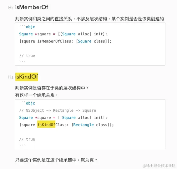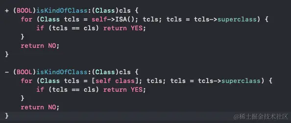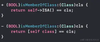 也分实例方法和类方法。 实例方法是把自身所属的类和传入的类作比较,静态方法是把自身的ISA指针和传入的类做比较。