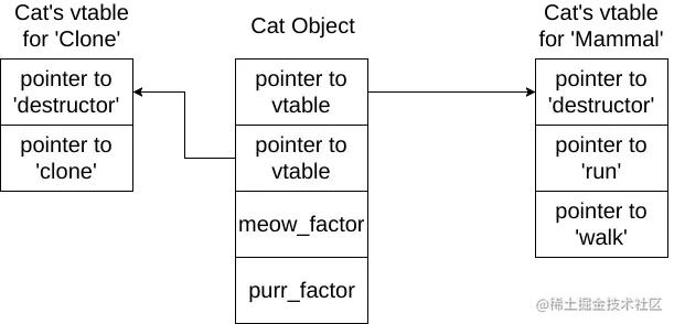 注意,我们现在有多个虚表指针,每个指针对应于Cat继承的一个基类(包含虚函数)。为了把一个Cat*转为Mammal*,我们不需要做任何事,但是要把Cat*转为一个Clone*,编译器将会为this指针增加 8 字节(假定 sizeof(void*) == 8 译者注:这里指地址山从 this 指针偏移 8 字节)。