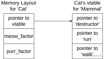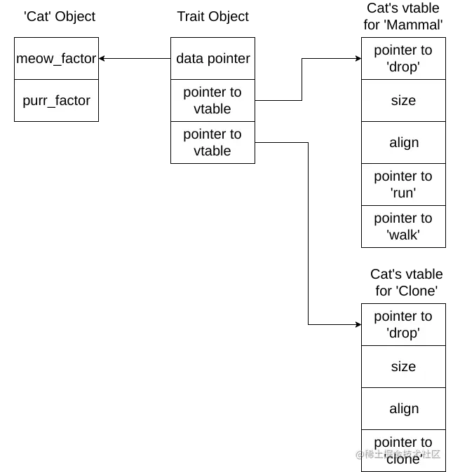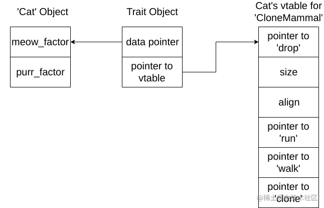 像 C++一样,动态分发(dynamic dispatch)在 Rust 中通过一张函数指针的表来实现(Rust 文档中的这里有描述)。根据文档,由一个Cat产生的Mammal trait 对象由两个指针组成,布局如下:
